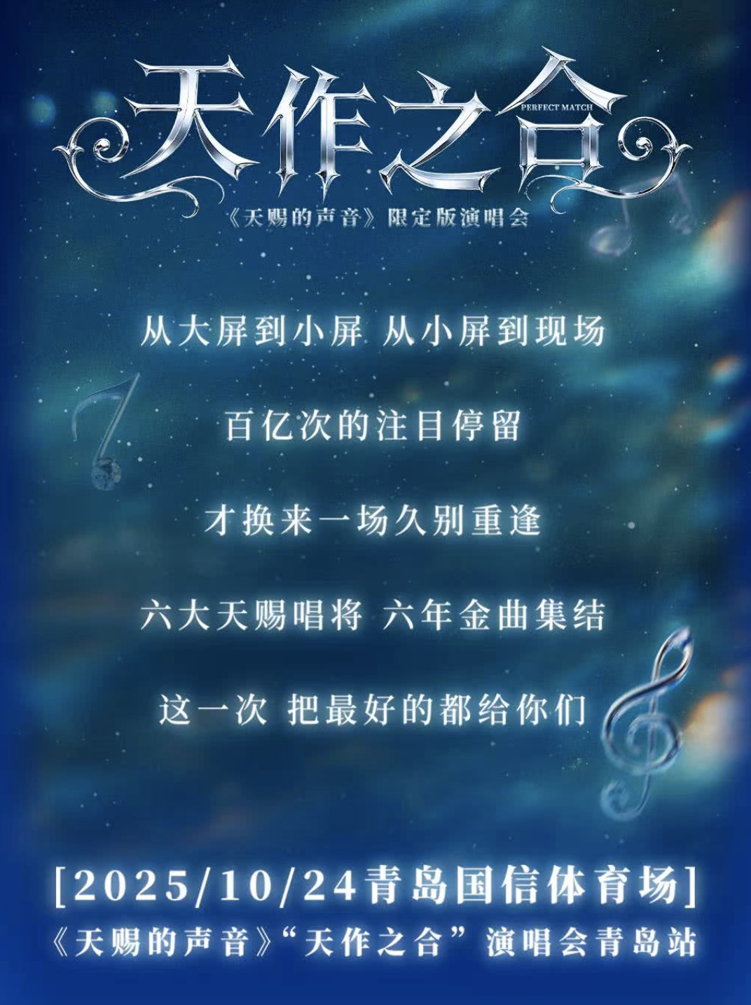 10 月的青岛将被音乐彻底点燃,张杰世界巡回演唱会与《天赐的声音》“天作之合” 演唱会,双场盛宴接连开唱!当天籁歌声遇上 “海上名山第一”,崂山风景区特意为奔赴热爱的歌迷备好专属惊喜,凭演唱会门票享景区门票半价优惠,让山海成为音乐之外的绝佳注脚!