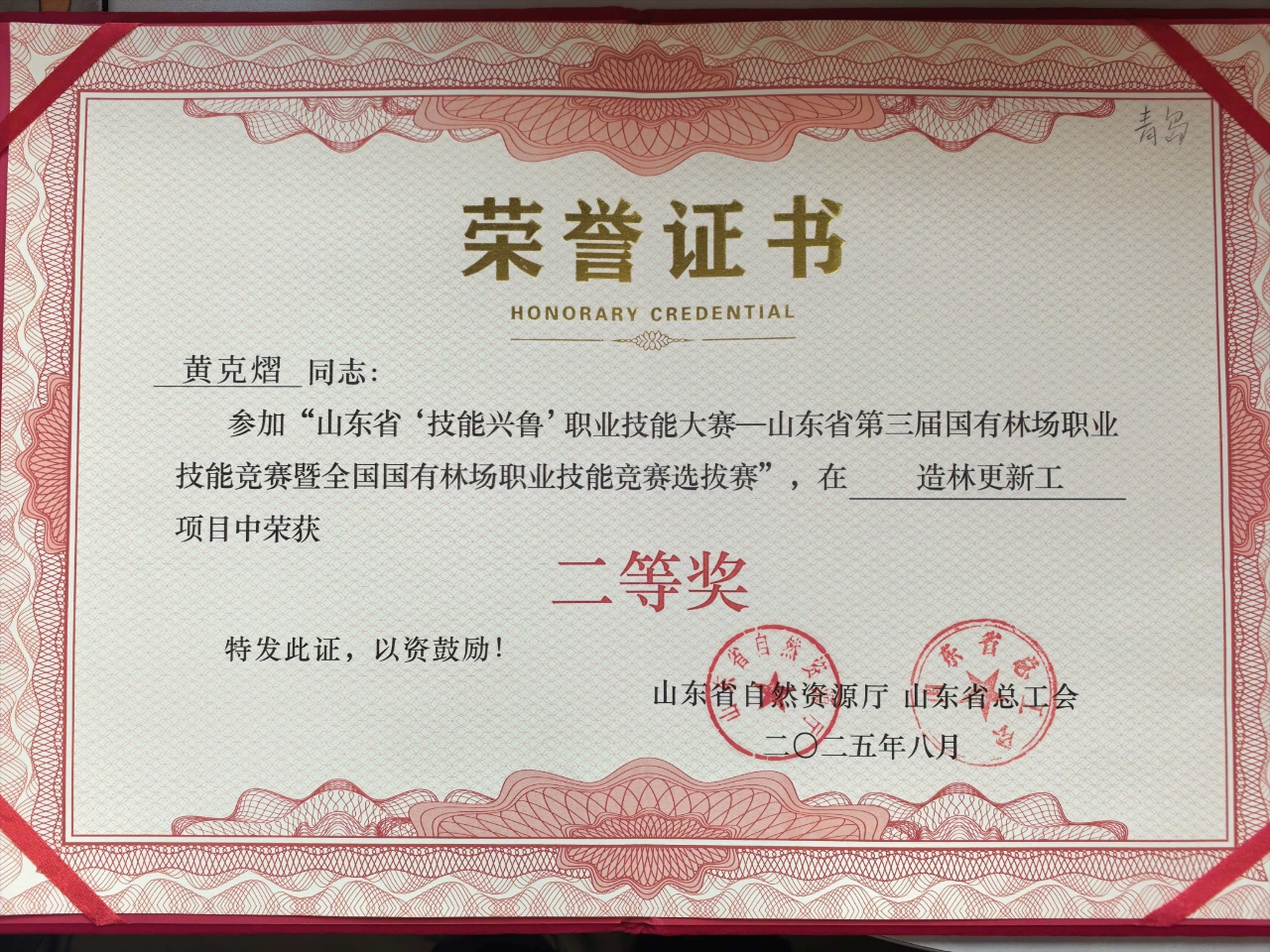 7月23-24日,山东省“技能兴鲁”职业技能大赛—山东省第三届国有林场职业技能竞赛在淄博原山林场成功举行,崂山林场代表青岛市参加本次技能竞赛,经过两天的激烈角逐,流清林区阎志波、夏庄林区黄克熠取得优异成绩,荣获造林更新工项目个人二等奖。