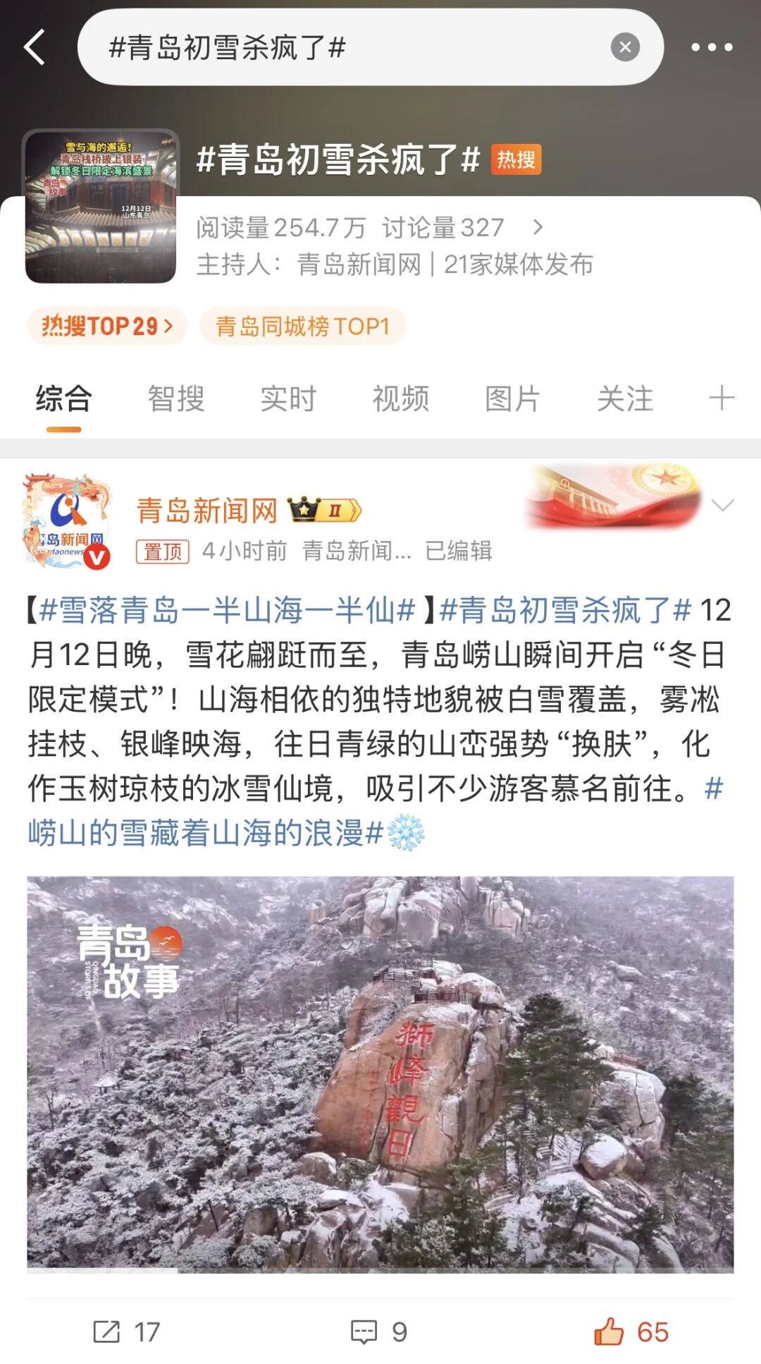#青岛初雪杀疯了#、#雪落青岛一半山海一半仙# 等话题迅速冲上微博同城热搜榜第一位,并跻身全国热搜榜Top 29,斩获实时阅读量1080万+!在榜时长近2小时,互动量、讨论量达6000次,崂山的雪,就这样“飘”到了全国各地~来过的游客深情表白:“崂山不仅景色绝美,服务也超贴心!”未曾踏足的网友则满怀憧憬:“已将崂山列入此生必去清单!”而这,仅仅是个开始。霸屏热榜!雪后初霁,奇观频现!
