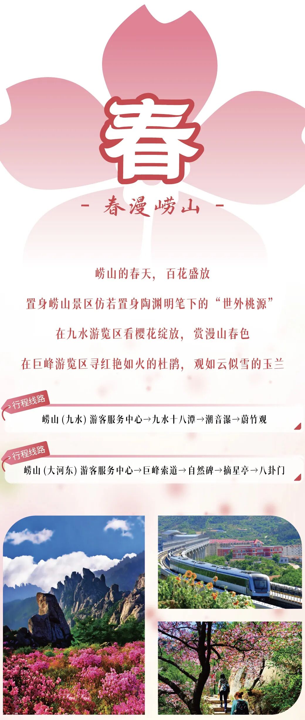 崂山的春天,是一场视觉与嗅觉的苏醒仪式,乘坐“开往春天的地铁”蓝谷快线,如同驶入动漫般的梦幻场景,山花烂漫、溪水潺潺,宛若一幅流动的山水画卷。