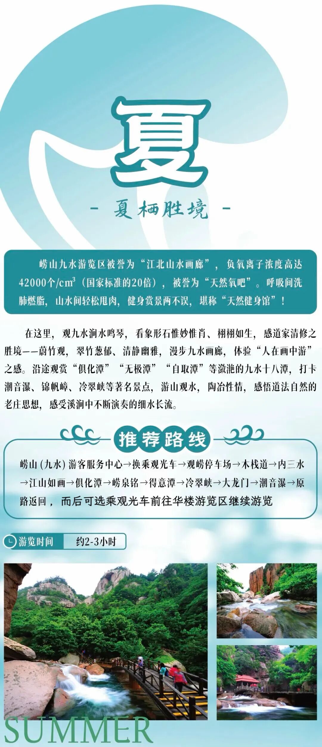 盛夏的崂山,是自带降温属性的避暑秘境!海风送凉、溪瀑奔涌,兼顾山水清爽与滨海野趣,酷暑天直接爽到飞起~游览完九水,还可以换乘景区观光车前往华楼游览区,探幽奇石,寻古石刻,畅游山水间!