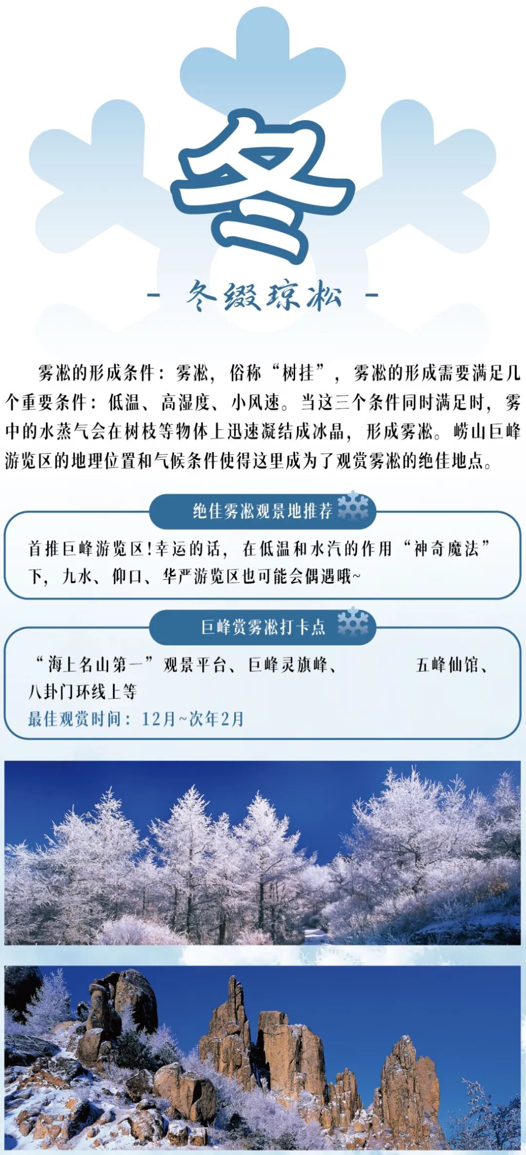 冬日崂山褪去喧嚣,藏着治愈系温暖!冰雪是它的高光时刻,每当雾凇出现巨峰便化身童话世界,松针与树枝被冰晶包裹,在阳光下晶莹剔透,九水的冰瀑堪称现实版“冰雪奇缘”。