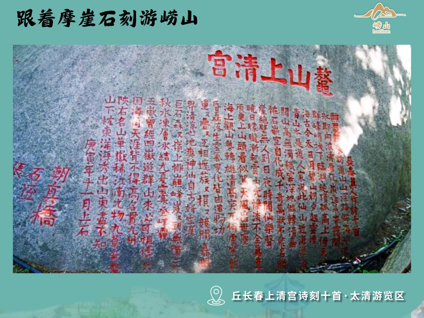 知识拓展:上清宫东北角墙外还刻有长春真人诗青玉案:“长春真人于大安己巳年,胶西醮罢,道众邀请来游此山。上至南天门,命黄冠士奏《空洞步虚》。毕,仍作词一首,名曰《青玉案》:‘乘舟共约烟霞侣,策杖寻高步。直上孤峰尖险处,长吟法事,浩歌幽韵,响遏行云住。凭高目断周四顾,万壑千岩,下无数匝地洪波,吞岛屿。三山不见,九霄凝望,似入钧天去。’又作诗十首,刻在别石。”