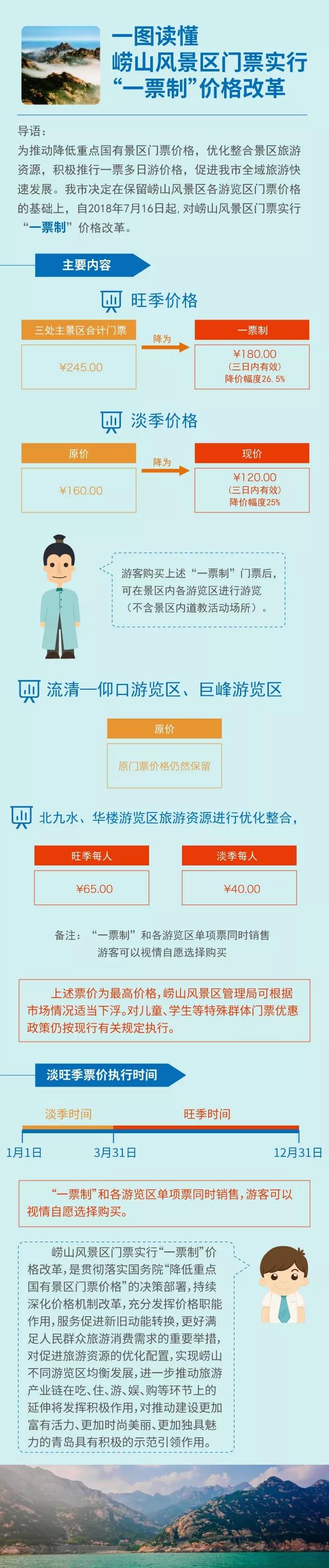 经青岛市政府同意,青岛市物价局下发文件,在保留崂山风景区各游览区门票价格的基础上,自2018年7月16日起,对崂山风景区门票实行“一票制”价格改革。