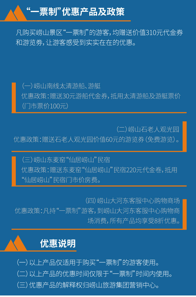 为了使广大市民能够享受到更多的福利,除了全新的景区套票,崂山风景区还推出了一系列优惠政策,7月16日至12月30日期间凡购买崂山景区“一票制”联票的游客,均可获赠价值310元的优惠大礼包。