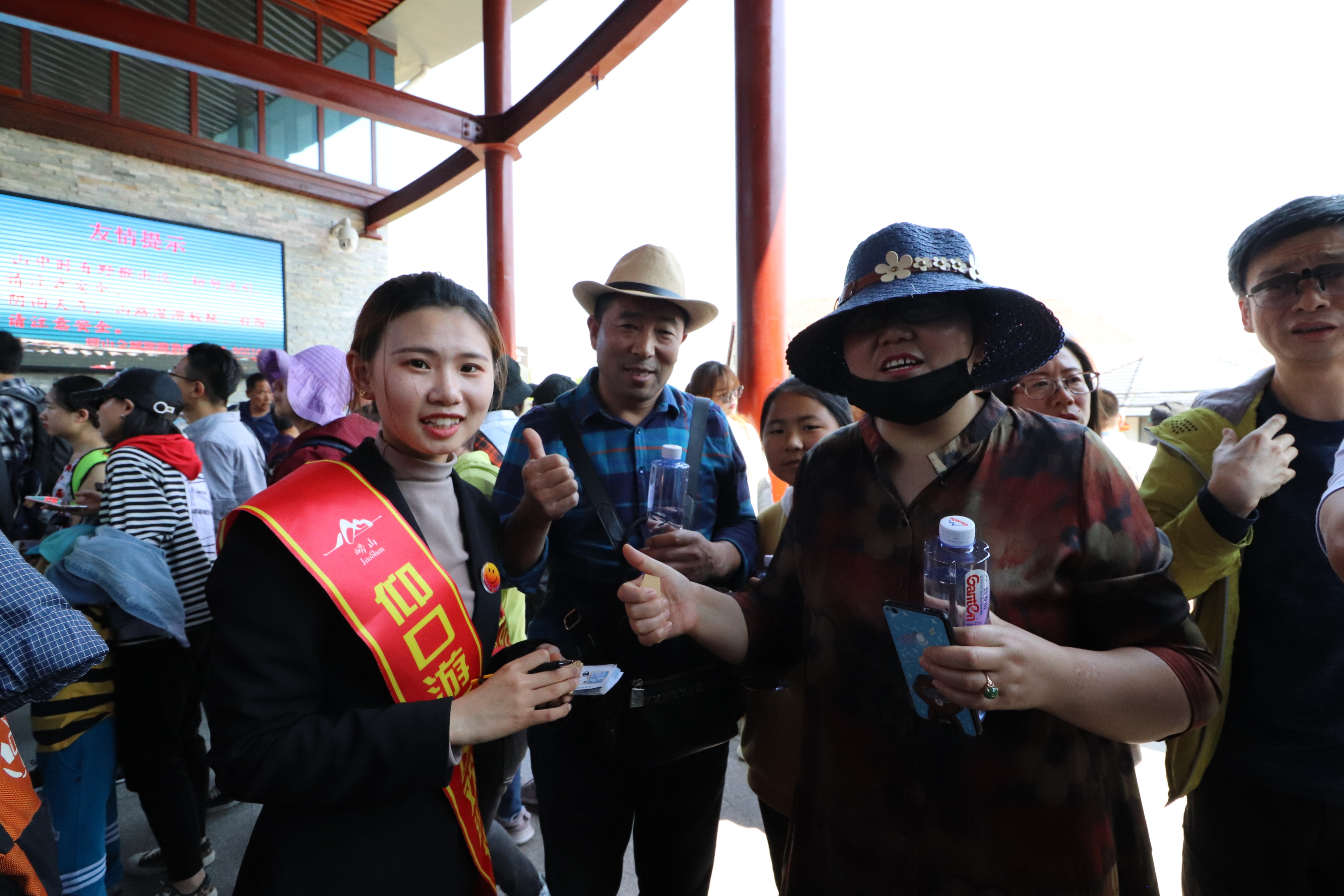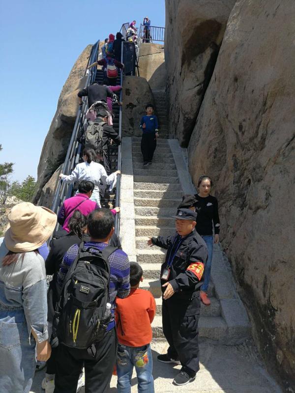 虽然接待任务繁重,可是热情服务不打折,景区工作人员克服连续作战的疲惫,继续保持热情服务游客的工作作风。一线工作人员身披绶带,微笑服务、耐心讲解,为游客带来好心情。景区志愿者服务站全天在岗,配备药品、针线包,热水、登山棍等物品,构建立体一站式服务体系,持续为游客提供咨询引导服务。