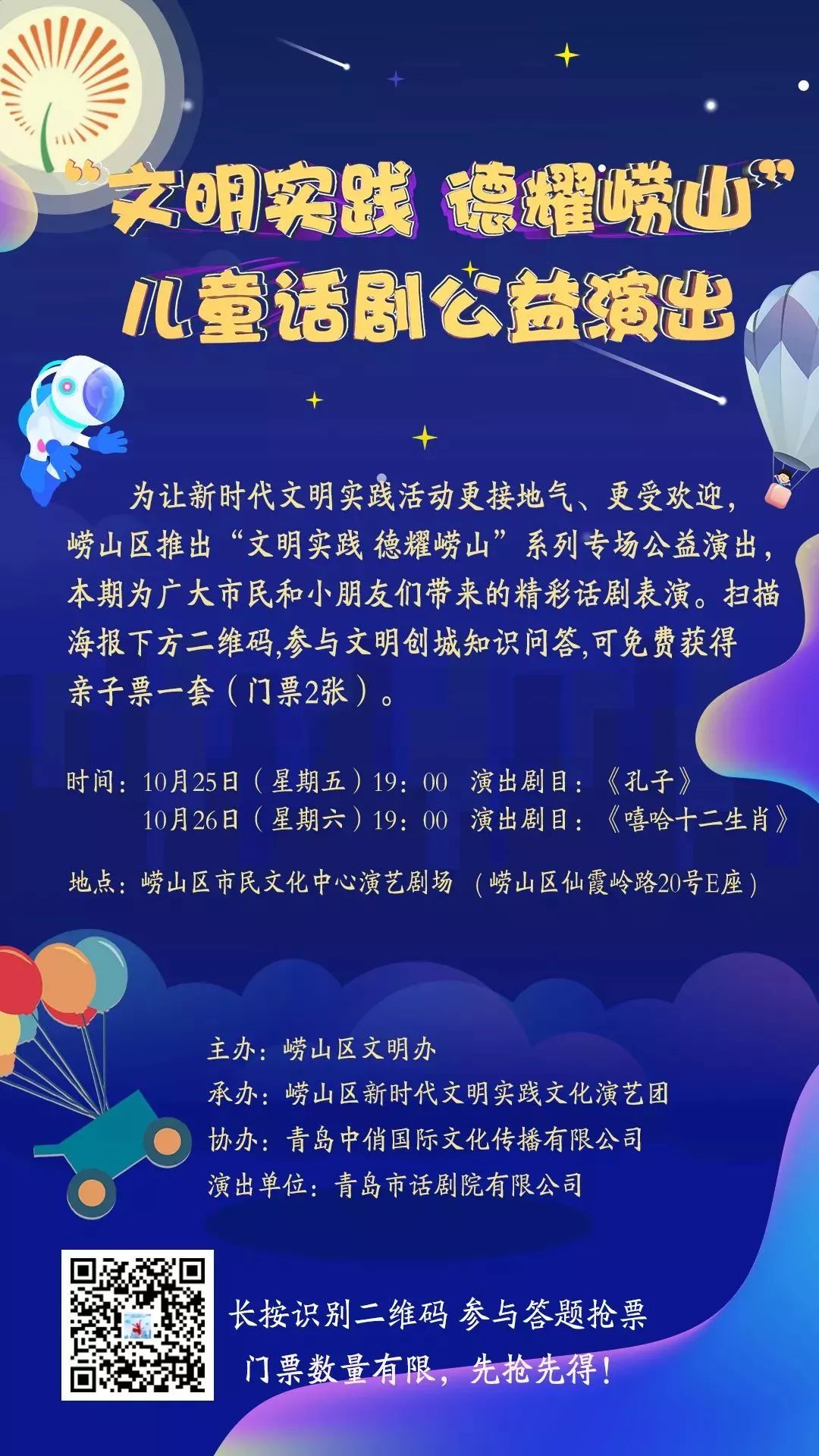 为让新时代文明实践活动更接地气、更受欢迎,崂山区推出“文明实践 德耀崂山”系列专场公益演出。本期为广大市民和小朋友们带来的精彩话剧表演。您可以通过扫描下方海报二维码,参与文明创城知识问答,即可免费获得亲子票一套(门票2张)。门票数量有限,先抢先得!