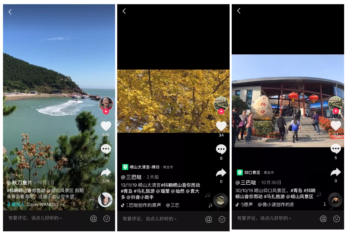 2019年9月23日,崂山区成功创建首批国家全域旅游示范区,山海湾城村全域旅游图景吸引着国内外游客。为展示崂山全域旅游资源,吸引游客深游崂山,自2019年9月起,由崂山区文旅委主办的“抖响崂山音你而动”短视频挑战赛正式开启,以新媒体形式,鼓励大家积极取景崂山,代言崂山。各路抖音达人用一部部创意作品将崂山的山海风韵,湾城美景展现在大家面前。
