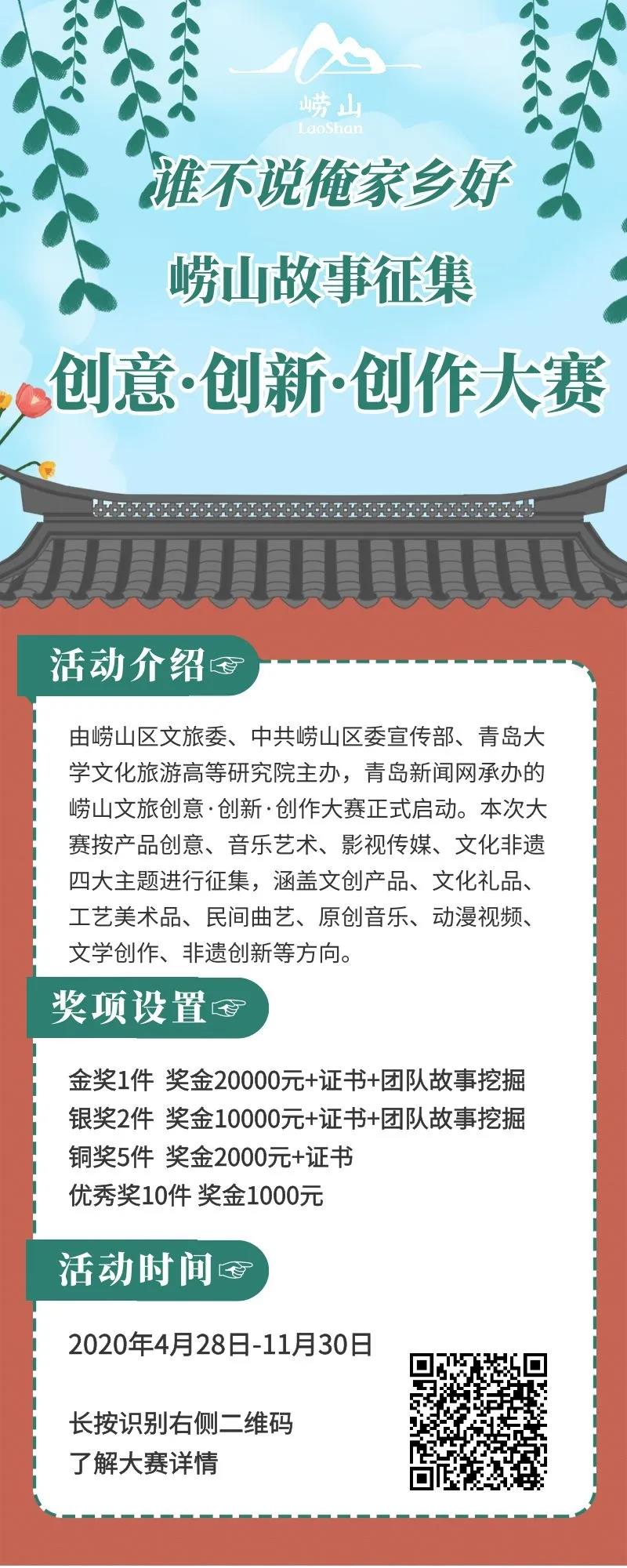 如果你有同样好的的创意,能让崂山故事文化焕发活力形成崂山特有的文化特色为崂山传统文化的现代化表达与传播提供可能,只要你有脑洞,有想法,敢创造,让崂山故事焕发新的生机和活力~六万元现金大奖就属于你!事不宜迟,快点把你的创意想法砸过来!快快扫描一下二维码,等你参与!