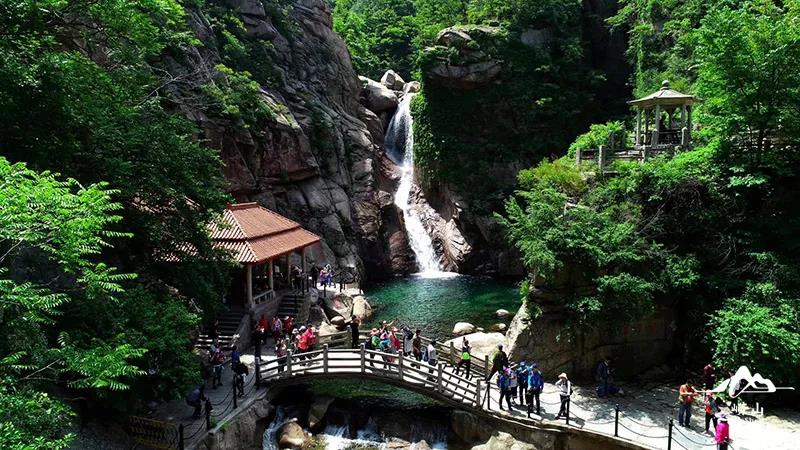 九水源自巨峰北侧海拔1100米的天乙泉,是崂山海拔最高的泉眼。九水还是崂山母亲河白沙河的上游,该区域负氧离子密集,是名副其实的“天然氧吧”。九水以其丽山秀水的天然画廊驰名中外,“五步一换景,十步一重天”,步入其中,游客也成了“画中人”。