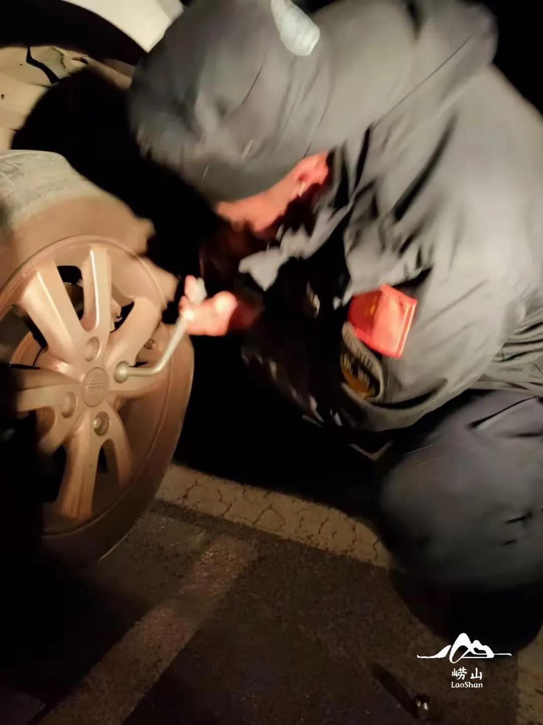 就在此时,景区工作人员李小鹏主动伸出援手,在零下几度的天里,没有专业的维修工具,就这样跪在地上一圈一圈的把车顶起来,换了轮胎,确认车辆安全后才离开,郑女士想要付费表达感谢,李师傅也婉拒了。