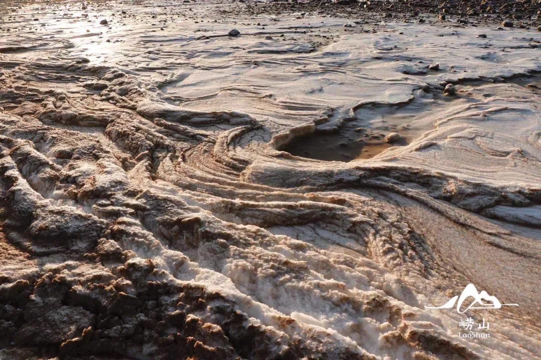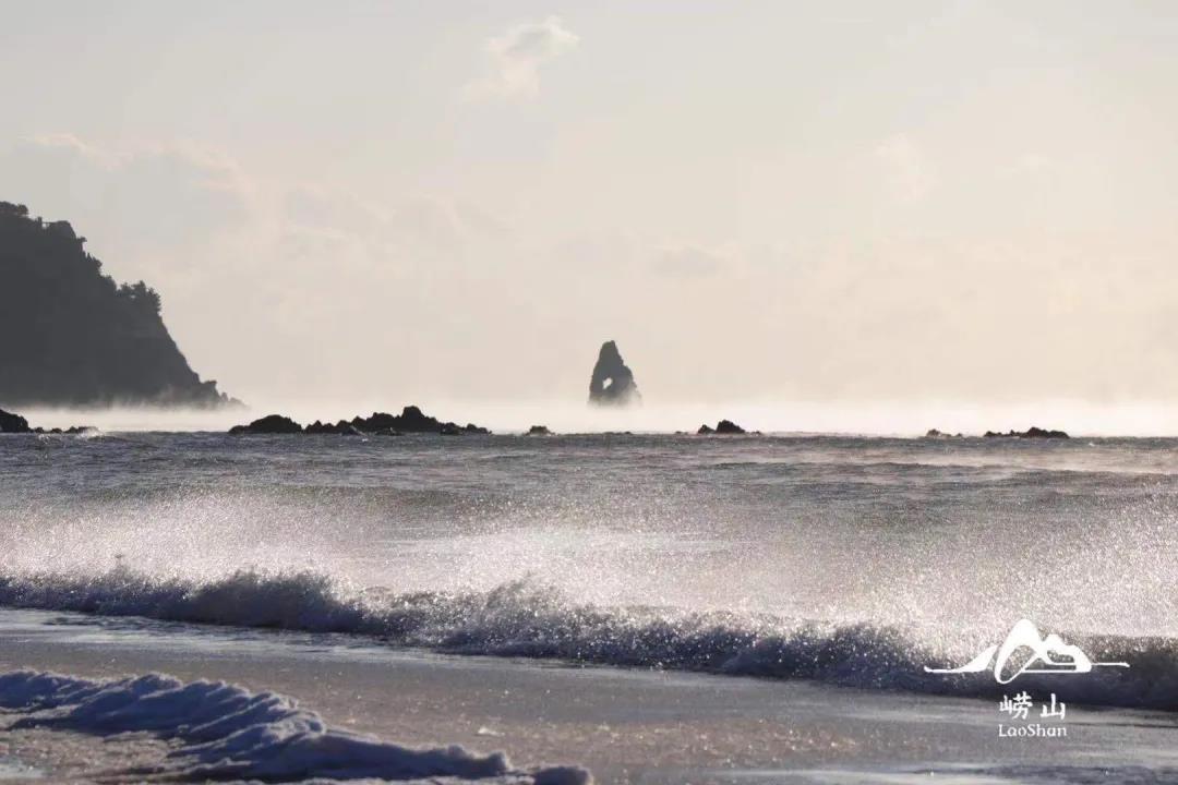 洁白的浪花也不舍与岸分别,像一层皑皑的雪铺满沙滩礁石,造型成了一道道恣意的图案,为崂山再添一层神秘之美