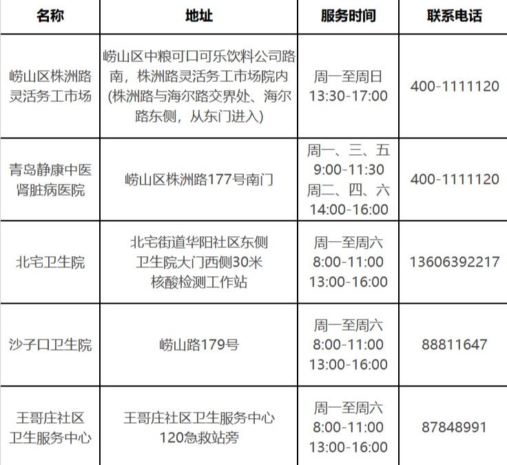 1.崂山区共设置核酸检测采样点5处,提供返乡人员核酸检测服务,详见下方崂山区返乡人员核酸检测采样点信息。