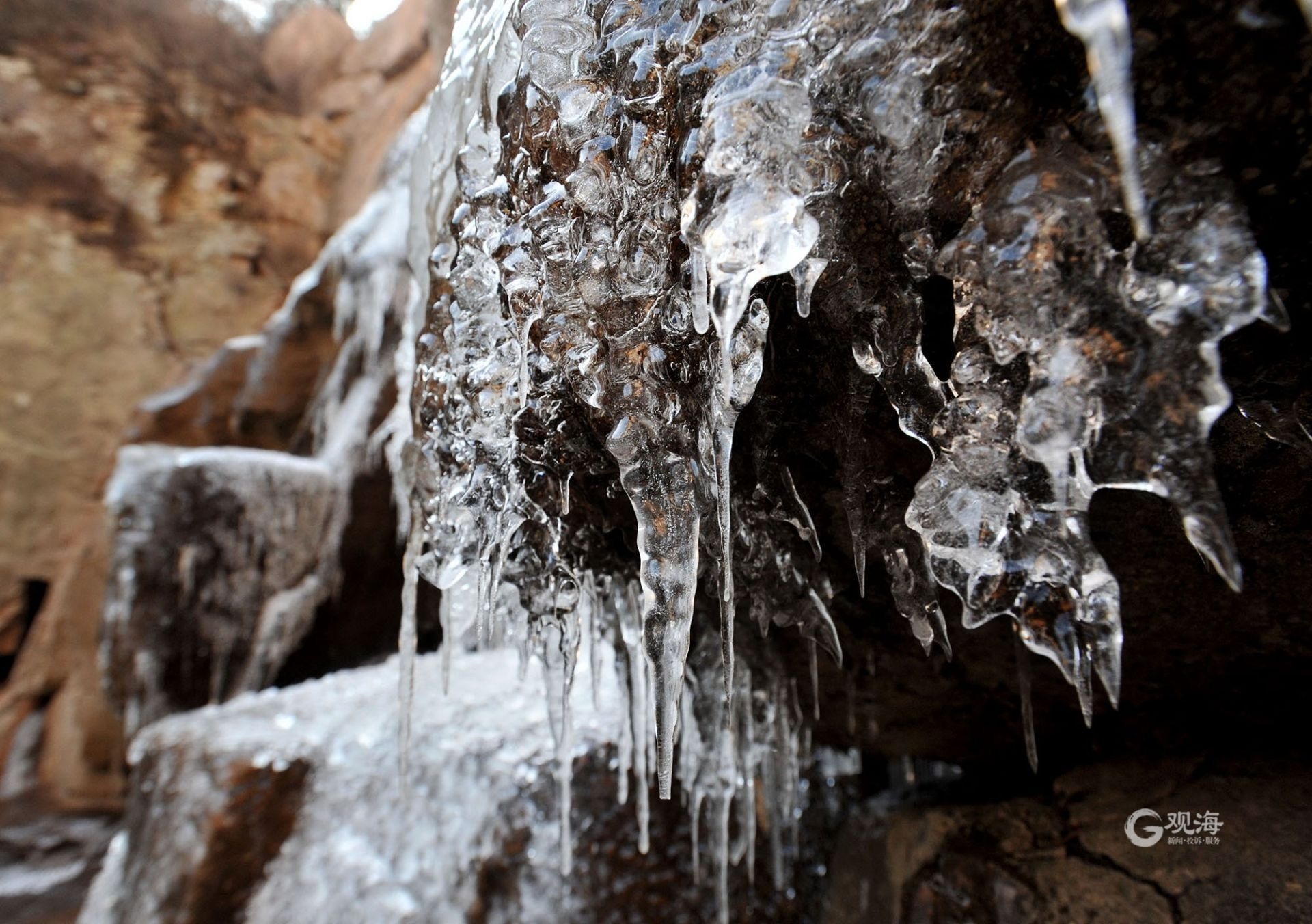 冰瀑初融,水滴顺着冰柱滴落。
