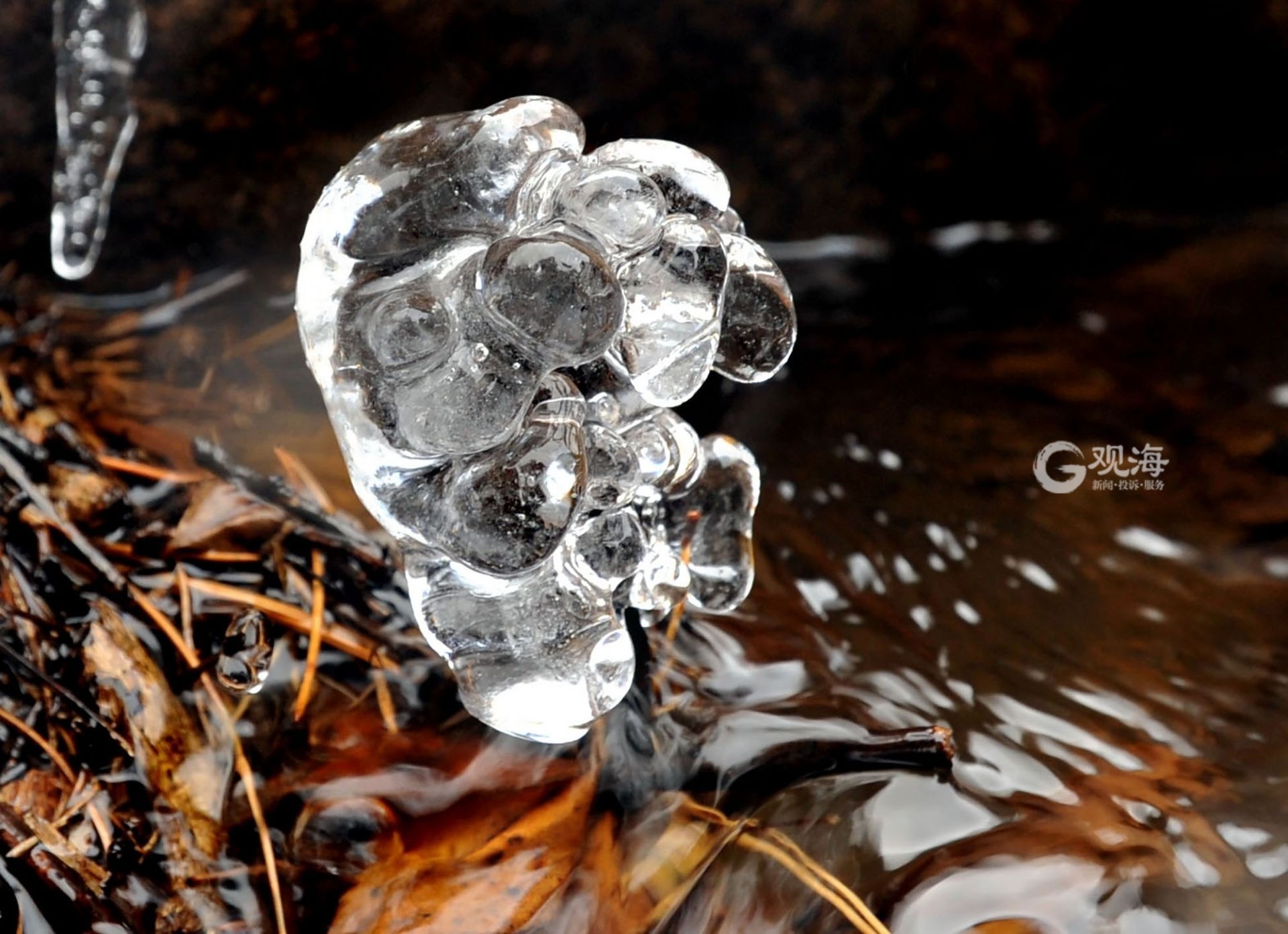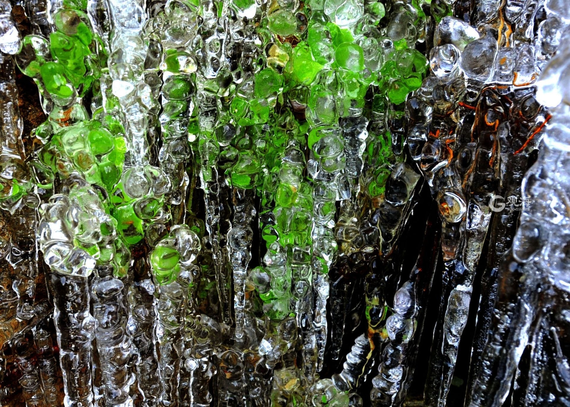 冰柱包裹着绿植,不经意间呈现出绿色的冰柱。