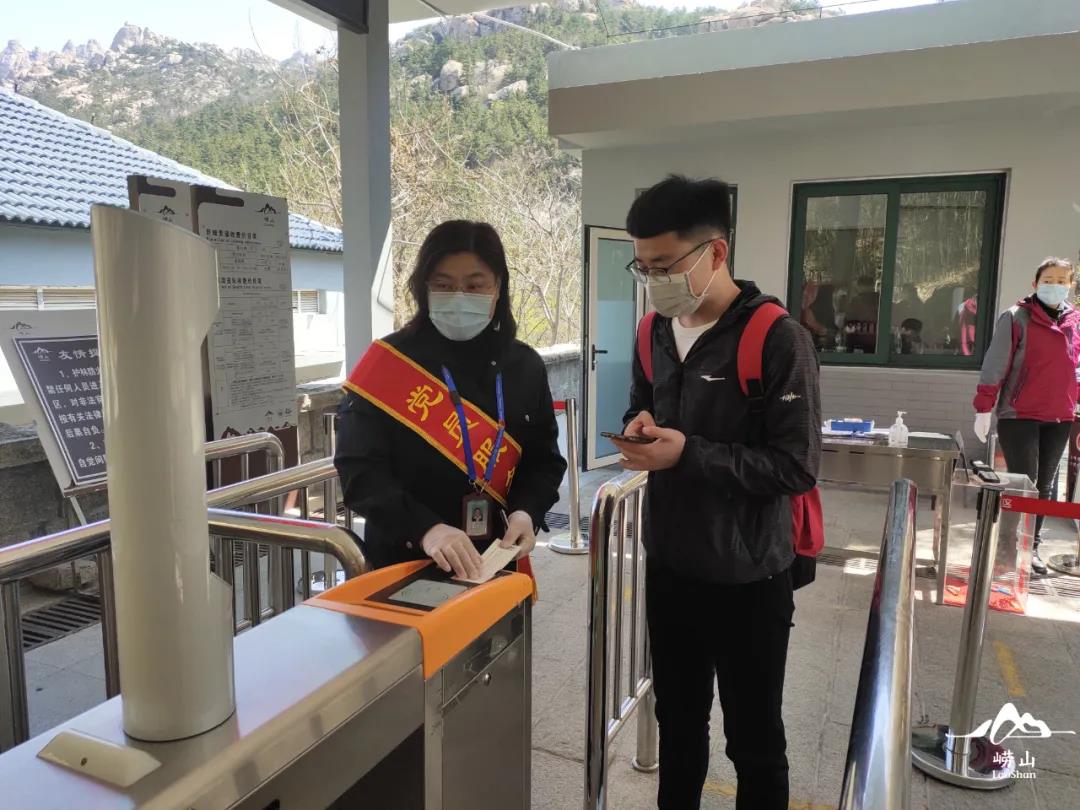 ▲崂山风景区党员志愿岗正在为游客提供检票入园服务 摄影:段珊珊