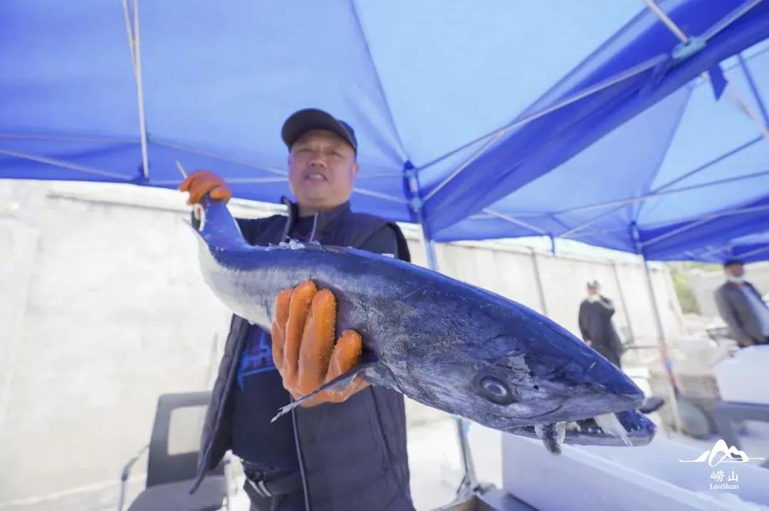 ▲“鲅鱼女婿”带着大鲅鱼上台展示。 摄影:观海新闻 宋新华