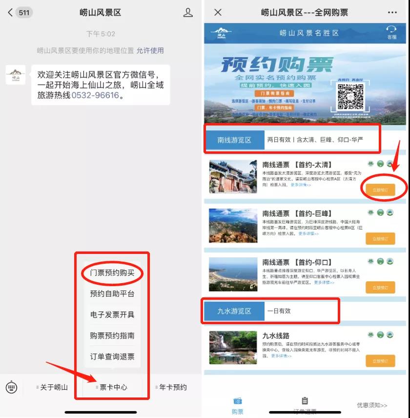 先预约再出发!五一小长假即将到来,请游客朋友们从正规途径预约购票,避免上当受骗。关注【崂山风景区】微信公众号,菜单栏点击【票卡中心】→【门票预约购买】,选择游览区预约购票,按预约入园日期及游览时间段,凭二代身份证原件或二维码入园。