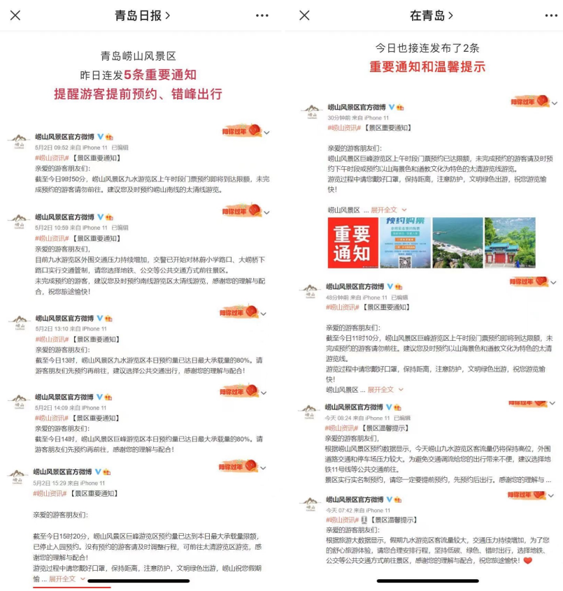 假期过半,错峰出游,享受愉快假期。为了您的舒心旅游体验,请您合理安排行程,请您选择地铁、公交等公共交通方式前往景区。有关景区预约、索道、天气等实时信息,请大家关注@崂山风景区官方微博,我们将第一时间通知大家。记得先预约,再出发~假期出游请与健康相伴,与文明同行!醉美崂山,欢迎您!
