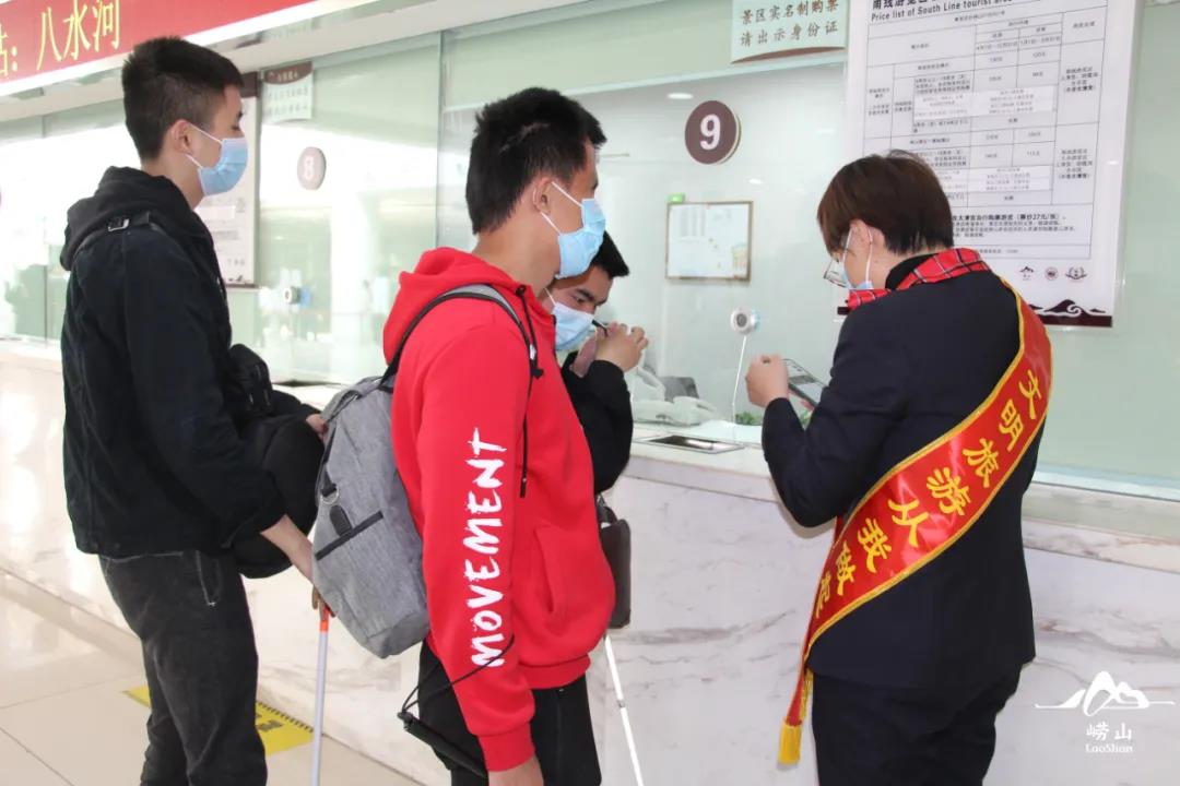 “您好,我是景区的讲解员,你们跟着我走吧,我把你们送到售票窗口。”说话人是崂山景区的讲解员王聪娣,刚走到公交车站,准备到工作岗位的她看到三位特殊游客,一人手里拿着一根盲杖,一边在路上敲打着,一边缓步前行,很明显他们是有视力障碍游客。跟随着王聪娣的脚步,他们三人顺利的来到崂山游客服务中心售票窗口前,接待他们的是客服中心的售票员朱鹏,经过仔细的核对证件,并详细的给他们讲解票证的使用方法后,朱鹏自然的牵起他们的手把他们带到了检票口,检票员张蔷、姜田田为他们开启检票的绿色通道并把他们一路送到景区观光车上,前后不超过3分钟。