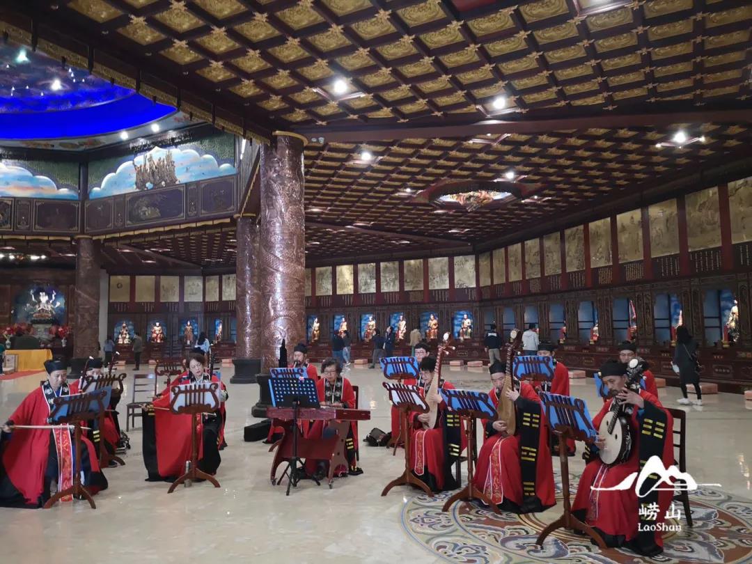 在老子铜像下的“玄深通幽”大殿,大家驻足聆听国家级非物质文化遗产——崂山道教音乐的演出,现场演奏的《听涛》《望海》等音乐深深吸引住了学员们的注意,他们表示这是第一次在崂山现场欣赏崂山道教音乐,崂山道教音乐历史悠久,具有深厚的地域特色,在中国民族音乐中占有一席之地,是一笔宝贵的民族文化遗产。
