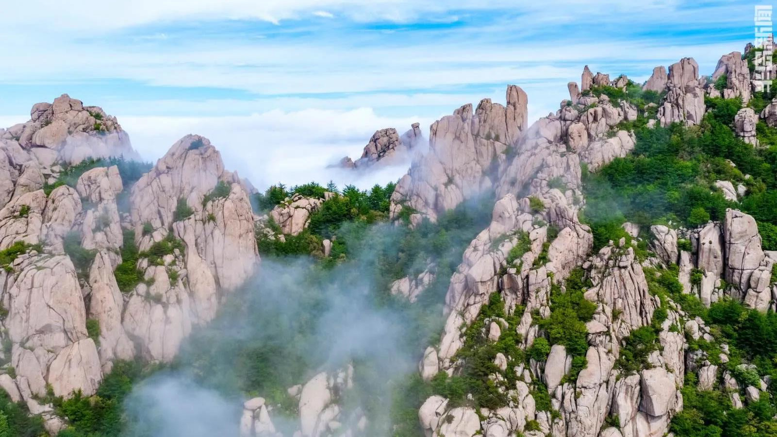 巨峰,浮云飘过。真,海上仙山!崂山巨峰现罕见云雾奇观。遥望仙气飘渺,近观青山叠翠。如梦似幻,人在其中宛若进入仙境。