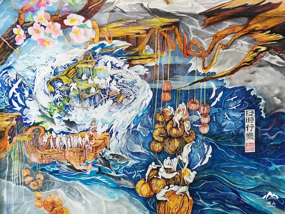 对于崂山的创作,不仅仅只是每日的随笔,还有许多绘画及文创作品。在他的作品中有一副专为崂山所创作了的巨型画《及时行乐》,这幅画以崂山山海为灵感创作耗时三个多月,细节需用放大镜去观察每一处,你可以发现太清宫内的凌霄侧柏,崂山的花草植物与动物微缩与纸上,山海盛景又给人无限的遐想。