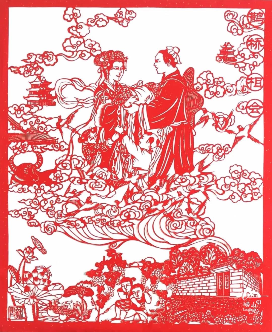 该幅剪纸描述的是牛郎织女七夕相会的场景:无数只喜鹊在天空飞舞,牛郎织女从天河两岸来到鹊桥中间相会。五彩祥云在他们身边环绕,远处的仙山琼阁若隐若现。身背草帽的牛郎用颤抖的双手接过织女为他和孩子们缝制的衣衫,目光中充满了对妻子无限的疼爱。织女头戴凤冠,眼含泪花,含情脉脉的注视着一年未见的丈夫。他们的一双儿女抱住织女的双腿,感受着久违的母爱,通人性的老牛站在一旁,仿佛也在为一家人来之不易的团聚默默祝福。画面左下方是盛开的荷花,一对象征甜蜜爱情的鸳鸯静卧水面。右下方是一座具有崂山特色的山村民居,少男少女躲在葡萄架下屏息倾听天上传来的绵绵情话。作品以古老的民间传说为主线,表达出一种对幸福爱情的美好祝愿。(简介撰写:王明伦)