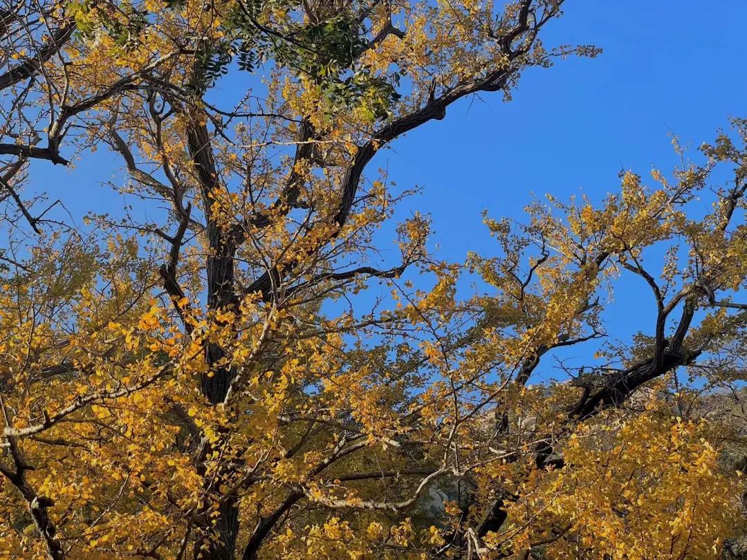 很多人惦记崂山的银杏叶黄了没有,估计再等一个星期左右,现在的颜色还是明黄与橄榄绿相间,只有零星几颗树呈现大片黄色的落叶。