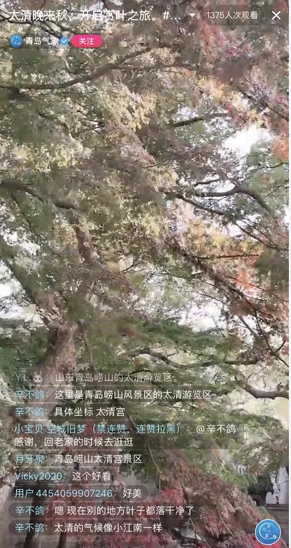 近日,青岛气象、浪涨小青岛抖音号,在青岛微信视频号以“云游青岛,打卡太清”、“太清晚来秋”等主题聚焦崂山,向全国网友直播展示崂山太清秋色,全网各平台累计观看量数万人次。