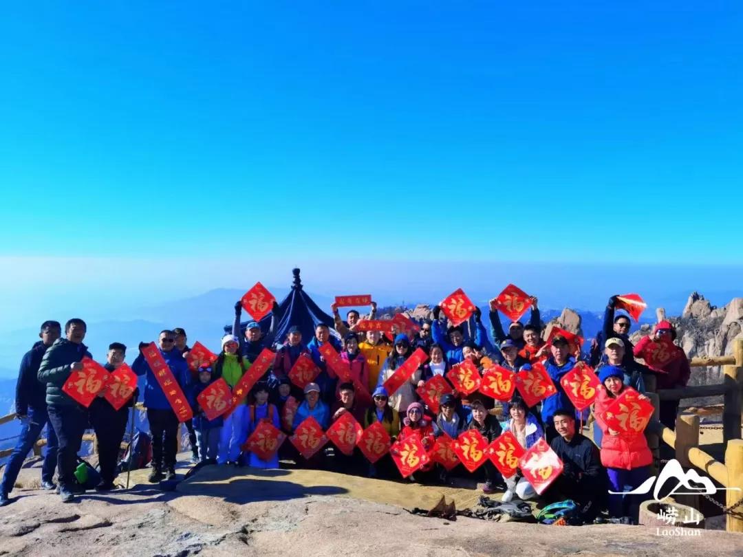 巨峰游览区举办“登临巨峰,共贺新年”活动,吸引了众多登山游客参与。他们与家人朋友结伴而行,带着“福字”、“对联”登上山顶,迎接新一年的到来,共同祈愿国泰民安、风调雨顺。很多游客每年都会和家人一起来登崂山最高峰,还会带着福字、对联,到达山顶一起拍照打卡,寓意新的一年步步高升。