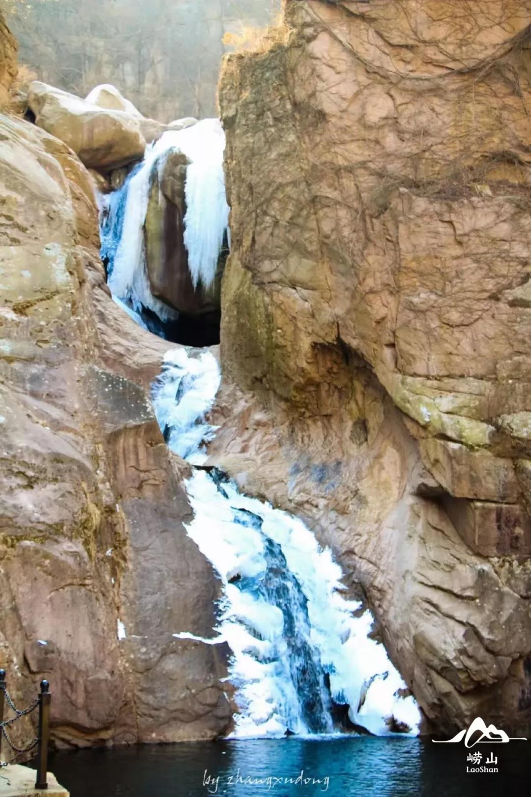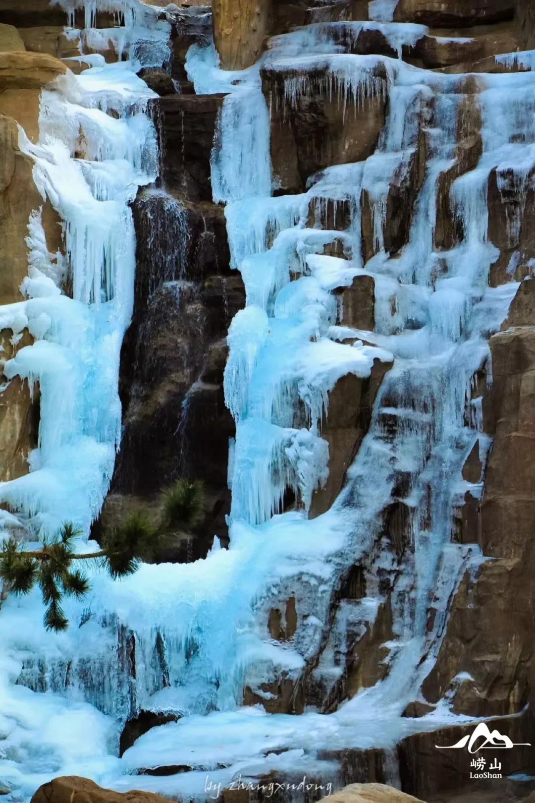 往日里流水潺潺的山间溪流,凝结成了洁白无瑕的“玉带”,高悬在九水的崖壁之上,不由让人感慨大自然的鬼斧神工,崂友 望之崂山 为九水所作的佳句,令人神往↓↓↓