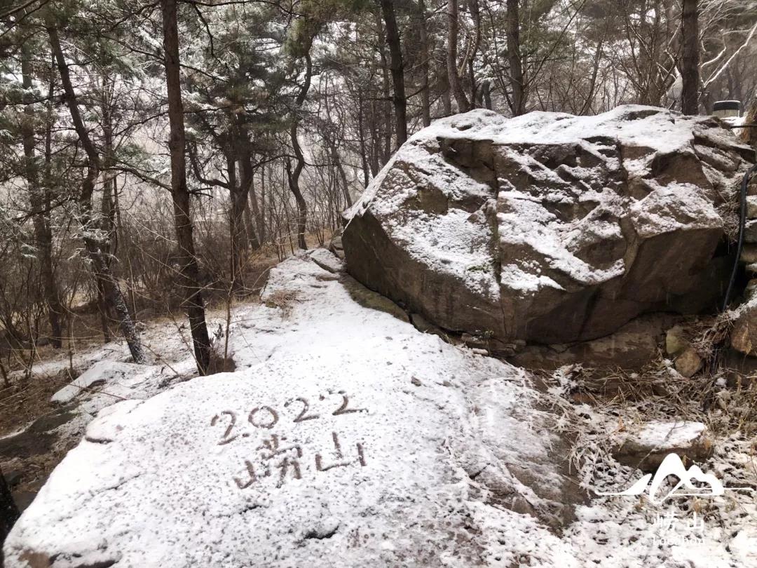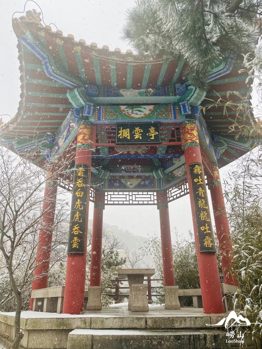 崂山,2022年第一场雪,“瑞雪兆丰年”,崂山巨峰迎来2022年的首场降雪。雪花一片片洋洋洒洒飘下,在空中轻舞、回旋,像簇簇松针,似银菊怒放,悄然覆盖巨峰山门、搁云亭,描绘出一个银白色的诗意世界,美不胜收。