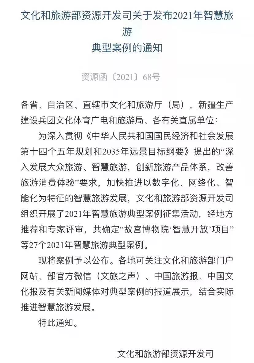 此次评选是为了深入贯彻《中华人民共和国国民经济和社会发展第十四个五年规划和2035年远景目标纲要》提出的“深入发展大众旅游、智慧旅游,创新旅游产品体系,改善旅游消费体验”要求,加快推进以数字化、网络化、智能化为特征的智慧旅游发展。经地方推荐和专家评审,共确定“崂山风景区全网分时预约售检票系统智慧化实践”等27个2021年智慧旅游典型案例。