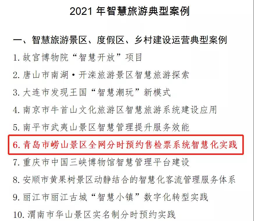 近日,文化和旅游部资源开发司公布了2021年智慧旅游典型案例,崂山风景区全网分时预约售检票系统智慧化实践作为全国智慧旅游景区运营典型案例成功入选。