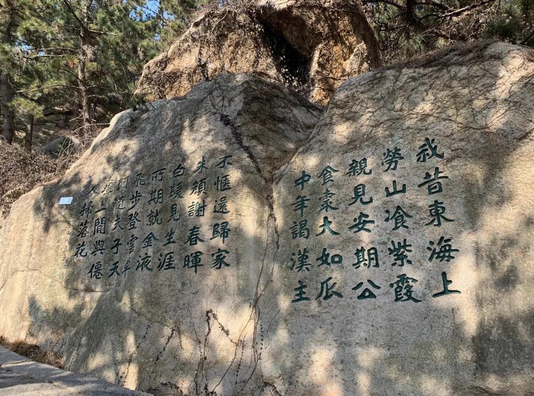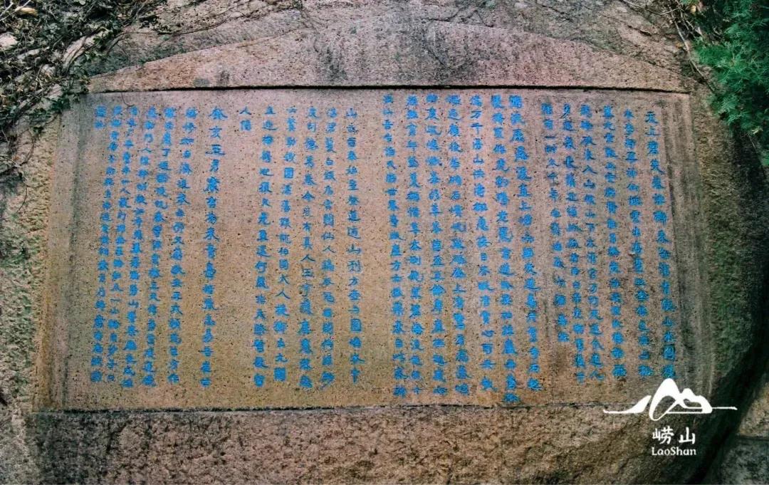 晋太安二年(公元303年),晋人在小崂山烟台顶完成了第一处刻石。至此一千七百余年来,唐人采药孙昙,南宋北七真丘处机、元成吉思汗敕谕刻石,明清以来的大学士陈沂、邹善、巡抚惠龄诸家,近代的徐世昌、康有为、傅增湘、蔡元培、闻一多、沈从文、梁实秋等文人墨客,都曾在崂山留下足迹。建国后尚有一些重要的纪念性碑记。