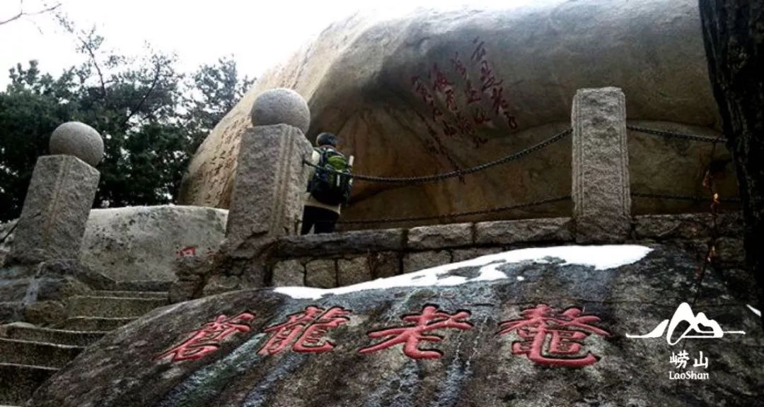崂山作为道教全真天下第二丛林,自古也受着道家文化的熏染,在仰口游览区太平宫附近,3块巨石构成了一个天然的石洞,洞外石壁上镌有凸刻双钩的4个大字——“鳌老龙苍”。