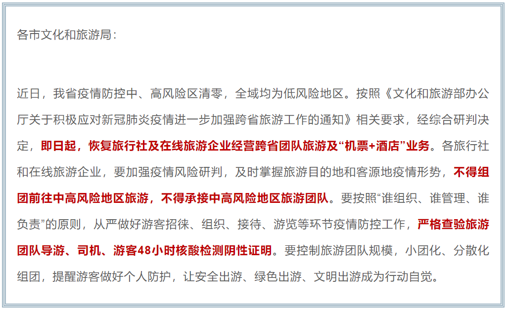 5月18日,山东省文化和旅游厅发布《关于恢复旅行社和在线旅游企业经营跨省团队旅游及“机票+酒店”业务的通知》即日起,恢复跨省团队游。