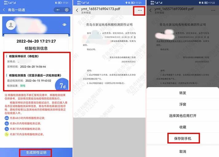 ③依次点击“生成阴性证明”-屏幕右上角的三个点(•••)-“保存到手机”,即可生成“青岛市新冠病毒核酸检测阴性证明”。之后大家便可自行打印该核酸阴性证明了。