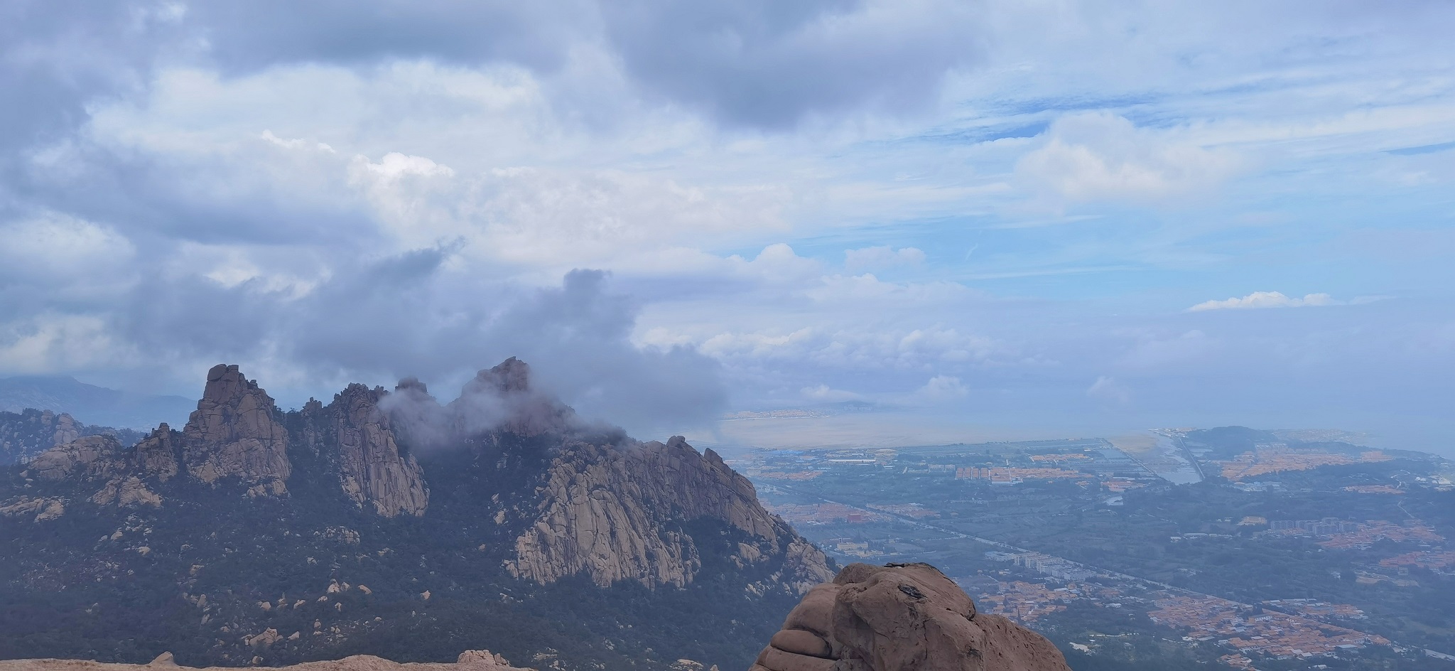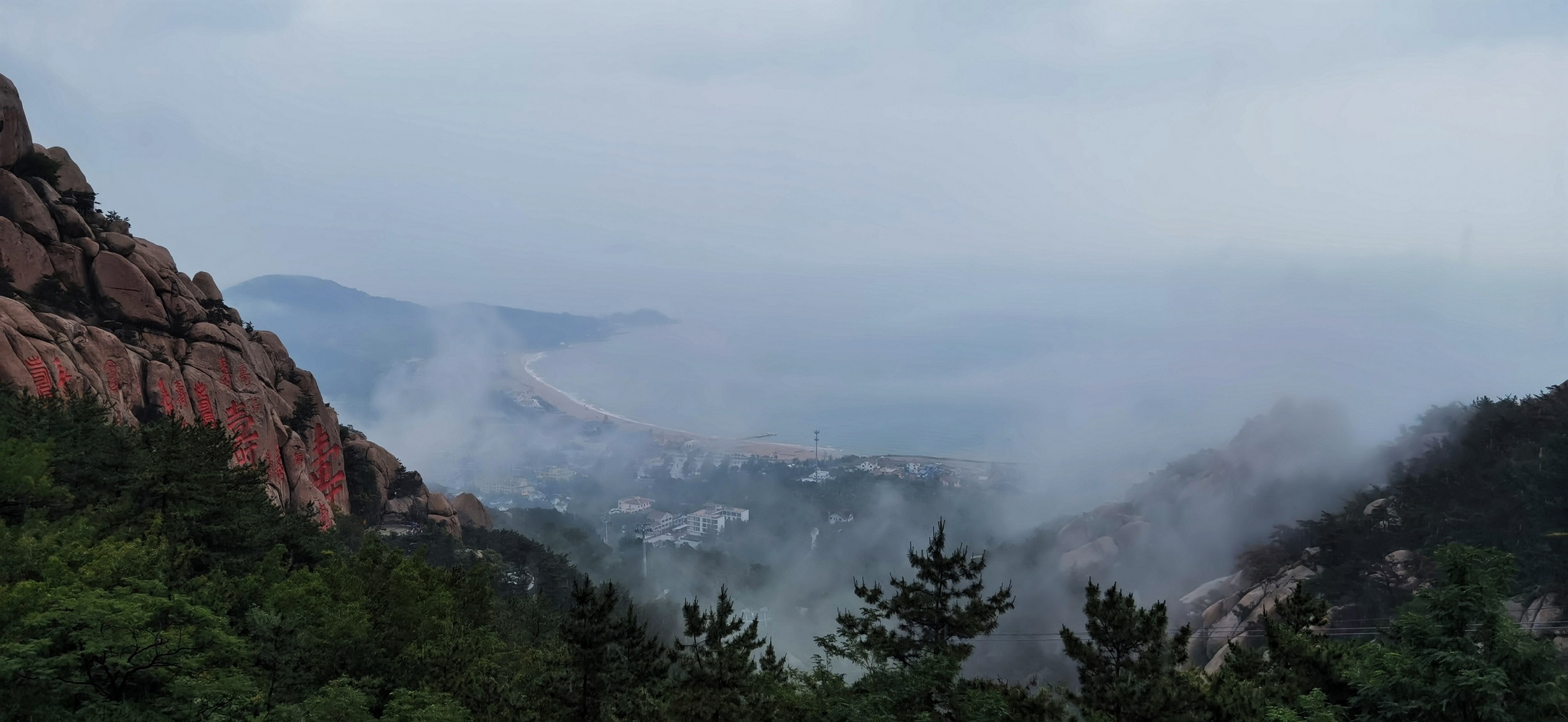 一夜的滂沱大雨,洗去了夏日的炎热和浮躁,降雨过后,崂山又美成了仙境,山色空濛、白雾氤氲,云海翻涌,如梦如幻,让人流连忘返。山谷的水汽凝结成云雾弥漫于山间,薄纱缥缈,时隐时现,乘坐索道上行,雾气在头顶缭绕,飘飘乎如羽化而登仙。登至山顶,雾气在身边时聚时散,仿若置身于天宫,放眼望去,云雾与青山相互缠绕、交集,大气磅礴,犹如一幅黛墨山水画在眼前缓缓铺开,美不胜收,吸引游客们纷纷来此打卡留念。