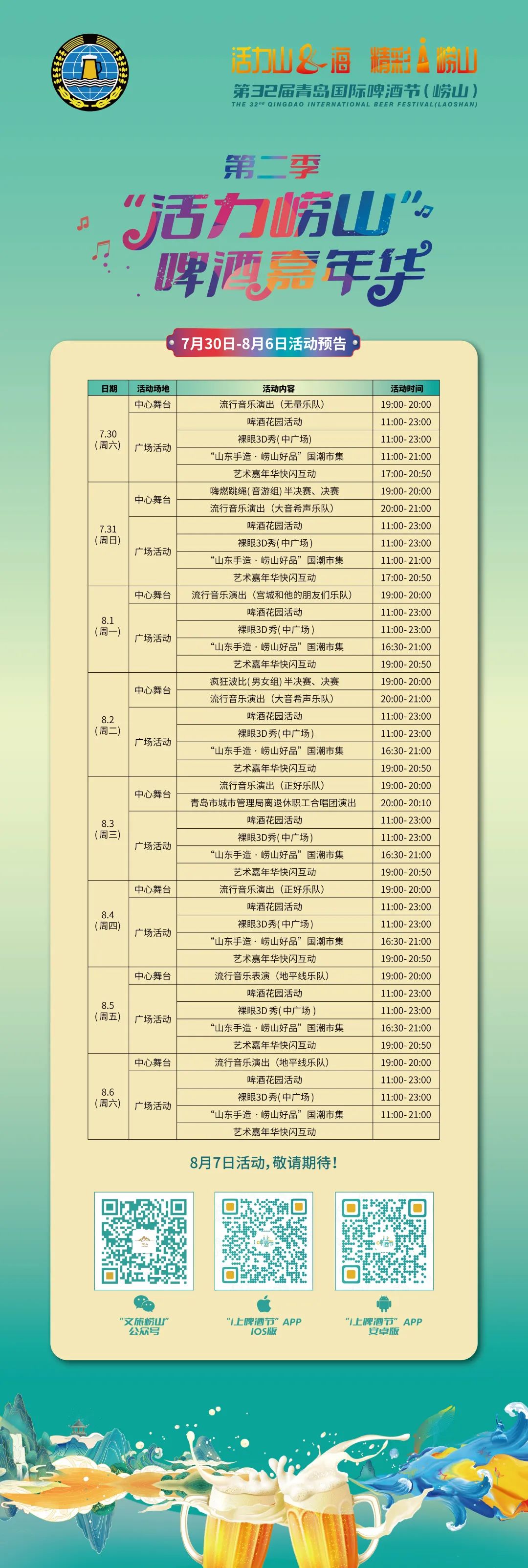 第32届青岛国际啤酒节(崂山)第二季“活力崂山”啤酒嘉年华7月30日~8月6日活动预告来啦!