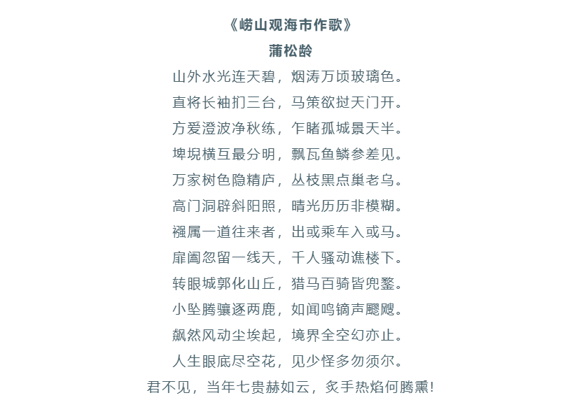 崂山,山海钟秀,人杰地灵,历史底蕴深厚,吸引了名贤文豪前来驻足,留下了绚丽华彩的诗词和脍炙人口的文章。崂山的千年文脉和独特的风土人情,也浓缩在一首首佳作中流传。特别策划《跟着诗词游崂山》,让我们在诗词中畅游崂山之美。本期,就让我们与诗歌同行,一起读一读蒲松龄的《崂山观海市作歌》。