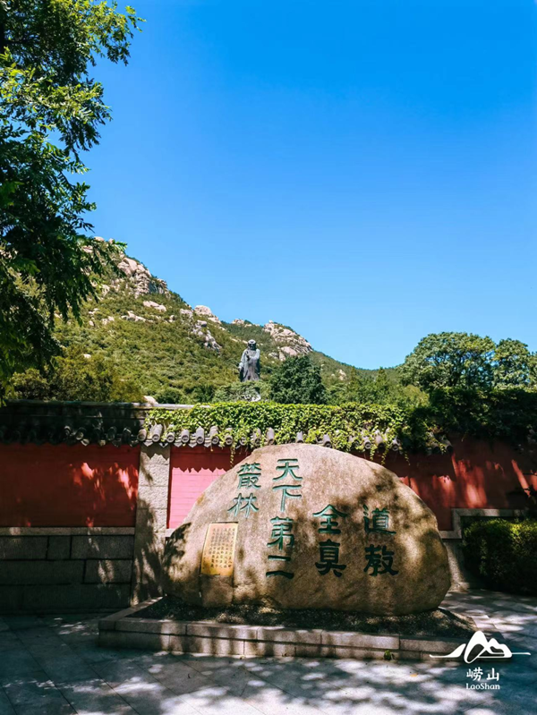 牌坊后面左侧的这处摩崖石刻——“道教全真天下第二丛林”,刻记了崂山道教在我国道教中的地位。前方掩映在古树古木中的千年道观,就是著名的太清宫。