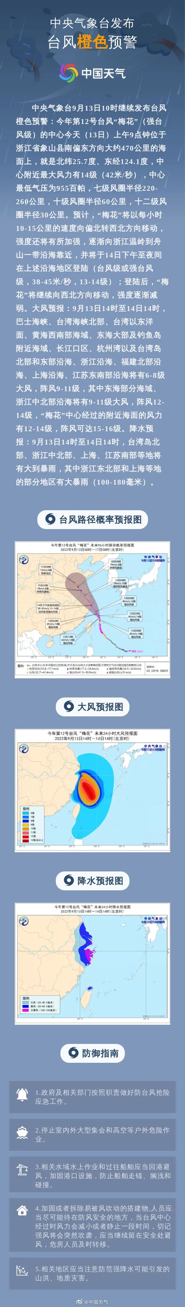 中央气象台9月13日06时发布台风橙色预警。今年第12号台风“梅花”,已于今天(13日)凌晨,移入东海南部海面,并于早晨5点钟加强为强台风级。中央气象台9月13日10时继续发布台风橙色预警。