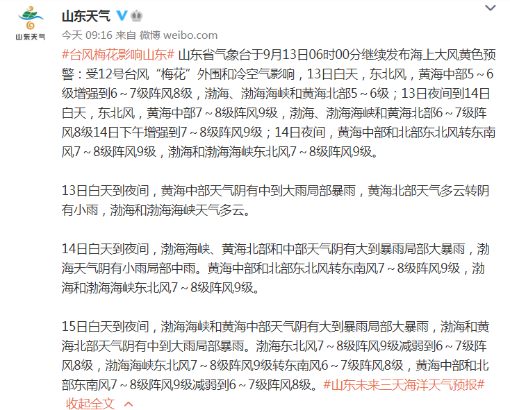 山东省气象台于9月13日06时00分继续发布海上大风黄色预警
