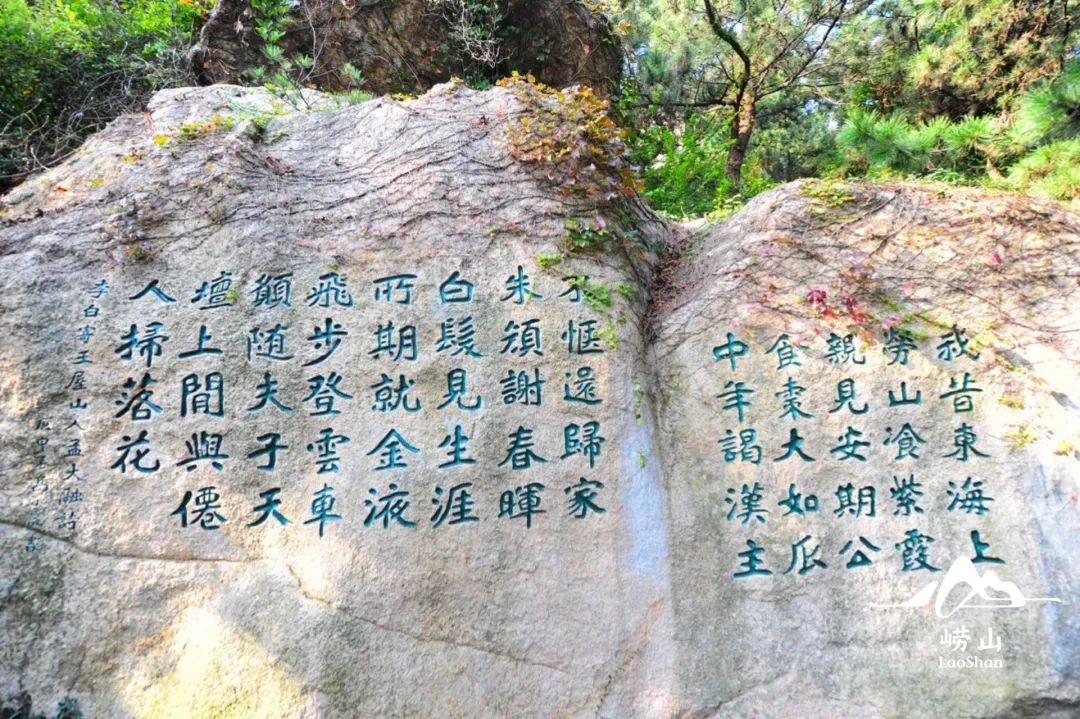 图丨从太清游览区垭口位置出发,沿蟠桃峰石梯北上,便能见到李白这首诗的石刻。此诗共13行,每行5字,竖排,字径25厘米,刻石面积8平方米,由青岛市书法家高小岩书。