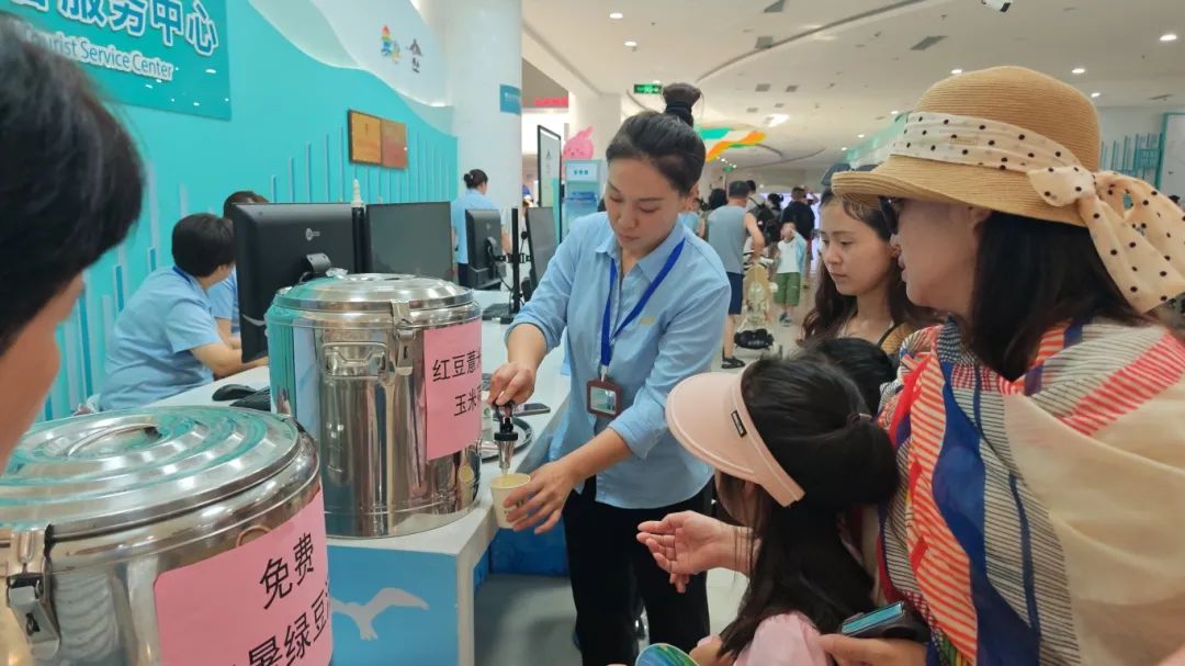 炎炎夏日,酷暑难耐,为给游客带来清凉与关怀,景区各游览区开展“夏日送清凉”活动,为游客提供消暑绿豆汤、崂山可乐等解暑饮品,获得游客盛赞。景区工作人员贴心地将精心熬制的绿豆汤,分装成杯递到游客手中,软糯、清热解暑的绿豆汤裹挟着沁人的凉意,游客们纷纷为景区的贴心服务点赞。