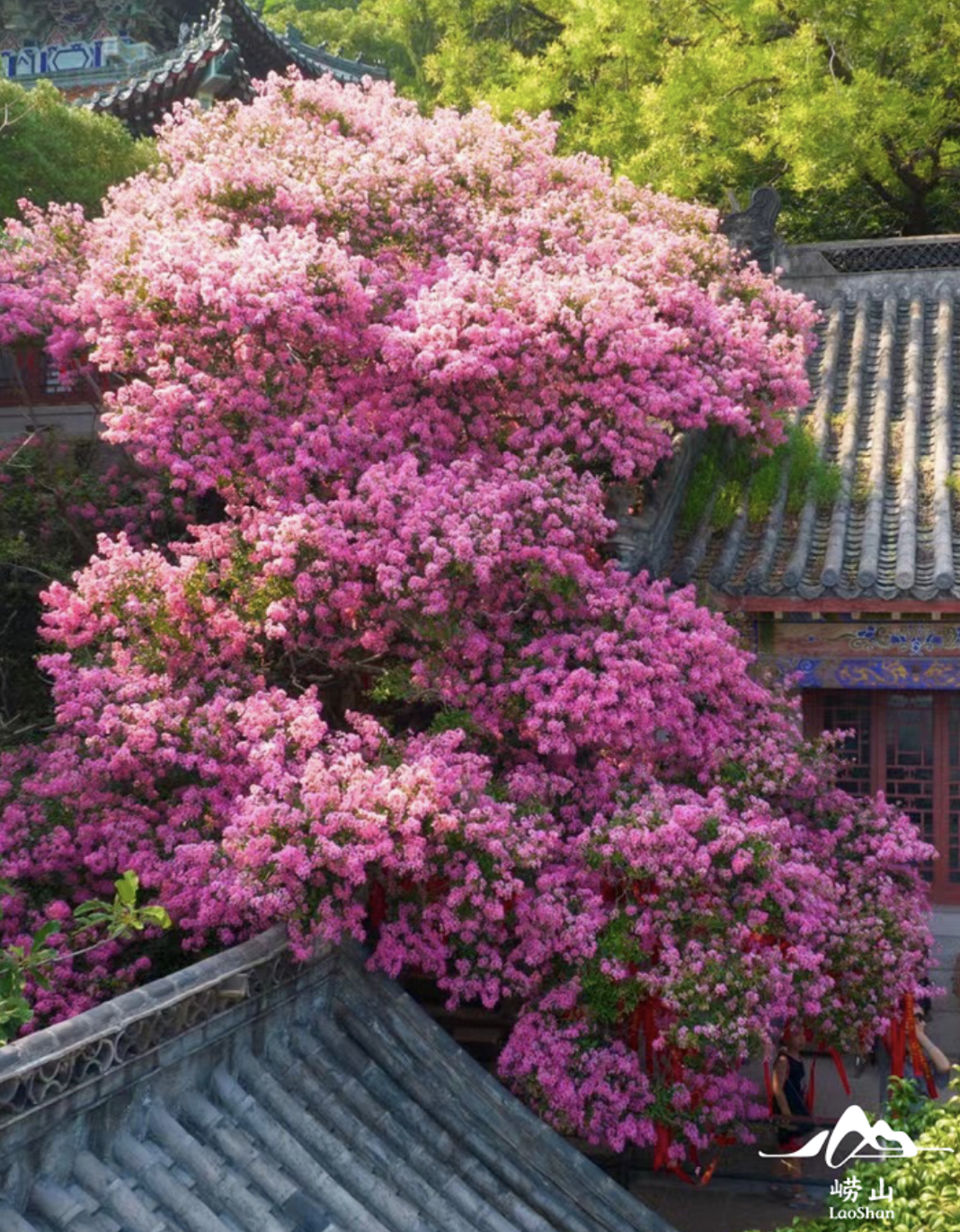 位于崂山太清游览区的明霞洞,一株超600年树龄的紫薇再迎花期,花朵绚烂粉艳。远远望去,树上的紫薇花灿若云锦,点缀在仙山明霞古观中,把夏日崂山渲染得明艳灿烂,在蓝天白云的映衬下如一幅水彩画,吸引了许多游客拍照留念。目前,紫薇正值赏花假期,赏花指南及详情请查收→《实拍!崂山600岁“紫薇仙子”盛放邀约!错过再等一年!》