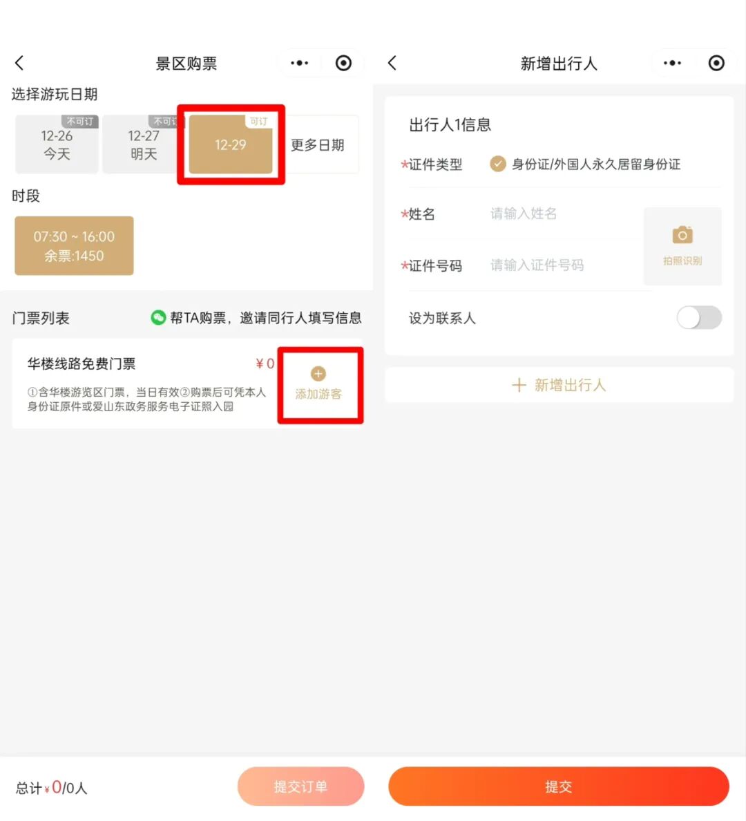3.选择计划游览日期,并添加游客,填写游客信息(姓名、身份证号、手机号),信息填写完毕后点击“提交”并确认;