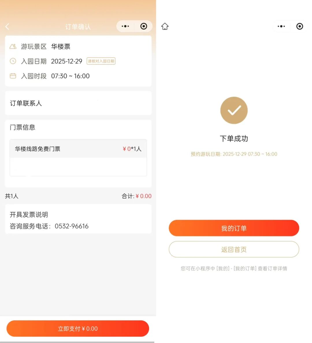 4.确认预约入园日期和游览人信息无误后,点击“立即支付”即免费预约成功,在预约游览日期持本人身份证原件刷证即可快速入园,无需线下换票。
